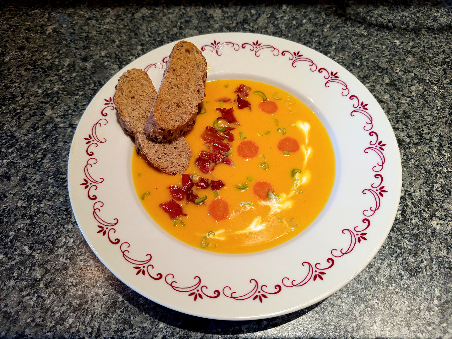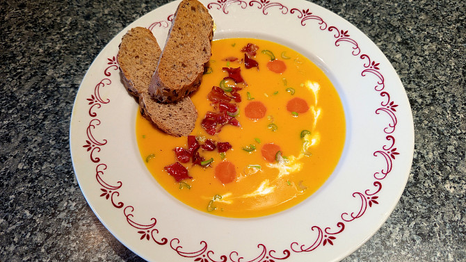 Jemný mrkvový krém s bramborami a smetanou vás zahřeje a posílí imunitu. Unikátní chuť dodá sýr cottage, který polévku obohatí o bílkoviny, a s rozmixovanou zeleninou tvoří lahodnou kombinaci. Polévku skvěle doplní křupavá slanina, bagetka a jarní cibulka.