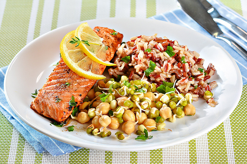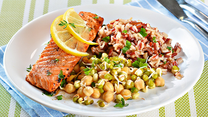 Citronový losos s indiánskou rýží, cizrnou a mungo fazolí