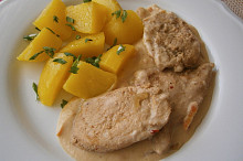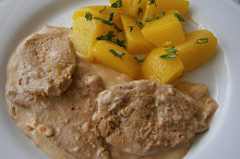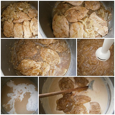 Domů - Recepty - Kuřecí plátky na cibuli se smetanovou omáčkou