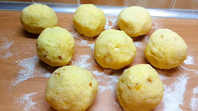 Krok 3: Ke konci zapracujeme do těsta kostičky housky i se všemi drobečky. Pokud je potřeba, můžeme přidat ještě trochu mouky. Z těsta vytvarujeme 8 koulí.