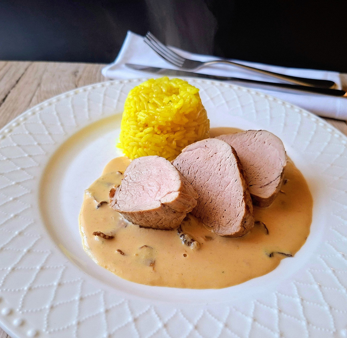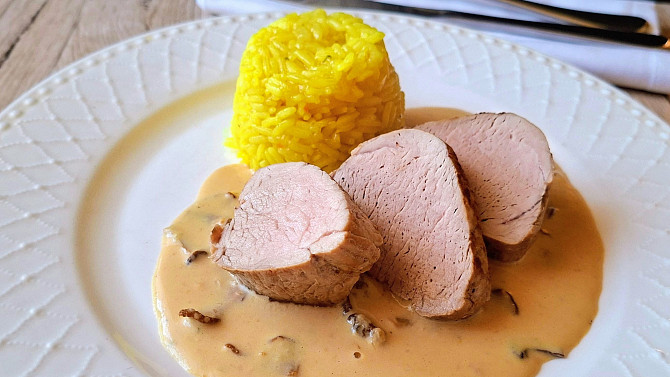 Pečeme v předehřáté troubě, dokud se všechna tekutina nevsákne (asi 30 minut). Hotovou rýži vyjmeme z trouby a pokračujeme v přípravě panenky. Krok 3: Panenku očistíme od blan, osolíme a opepříme ze všech stran a orestujeme na oleji s máslem. Opečené maso zabalíme do alobalu a vložíme na 20 minut do trouby předehřáté na 160 °C. Krok 4: Do výpeku z masa dáme restovat nadrobno nakrájenou oloupanou cibuli a necháme ji zesklovatět. Poprášíme moukou, za stálého míchání opražíme a zalijeme vývarem. Důkladně rozmícháme, aby se neutvořily hrudky. Krok 5: Přidáme scezené houby, osolíme, opepříme a povaříme asi 20 minut. Nakonec vlijeme smetanu a podle chuti dosolíme. Krok 6: Na talíř dáme kopeček rýže, porci omáčky a nakonec plátky panenky.
