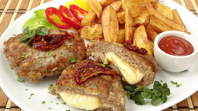 Šťavnaté hovězí karbanátky uvnitř ukrývají rozpuštěný sýr, který jim dodá ještě plnější chuť. Podávejte je s domácími hranolkami a čerstvou zeleninou. Oblíbenou klasiku tak snadno proměníte ve slavnostnější jídlo, kterému nikdo neodolá.