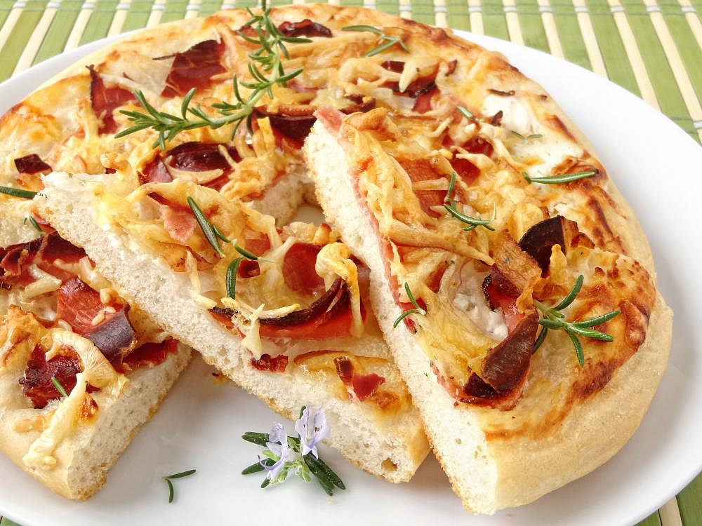Slaný koláč s křupavou tyrolskou slaninou, ementálem a základem ze zakysané smetany. Těsto s kypřicím práškem nevyžaduje kynutí, takže tuhle sytou placku s vůní rozmarýnu a česneku zvládnete připravit bleskově jako rychlou večeři nebo chuťovku.