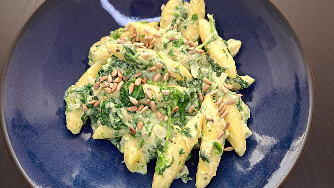 Bramborové šulánky v jemné smetanové omáčce z mraženého špenátu, česneku a mozzarelly tvoří snadný bezmasý pokrm. Doplňte je o opražená slunečnicová semínka a servírujte třeba jako rychlý oběd nebo večeři.