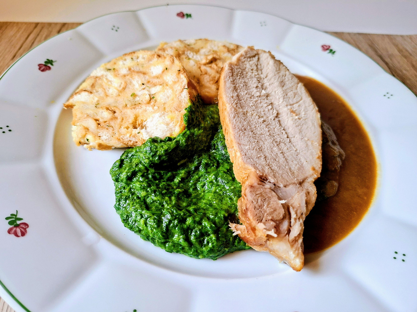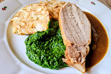 Vepřová pečeně na česneku, smetanový špenát a karlovarský knedlík