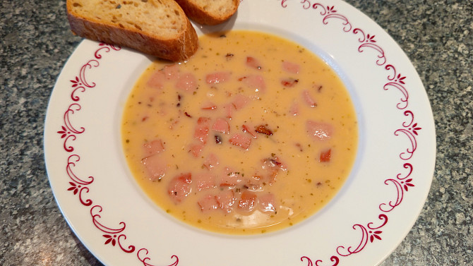 Jednoduchá polévka z hrachu a čočky, které se nejdřív uvaří s cibulí, česnekem a kořením doměkka a pak rozmixují dohladka. Na závěr polévku doplní osmažená uzenina, která jí dodá výraznou chuť. Skvělá jako sytá večeře nebo rychlý oběd.