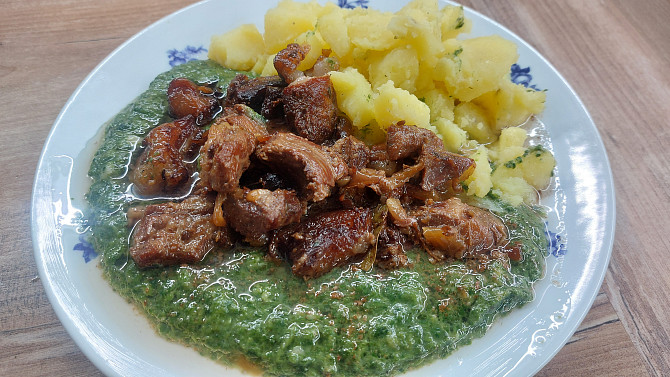 Vepřová pečeně na česneku, smetanový špenát a karlovarský knedlík