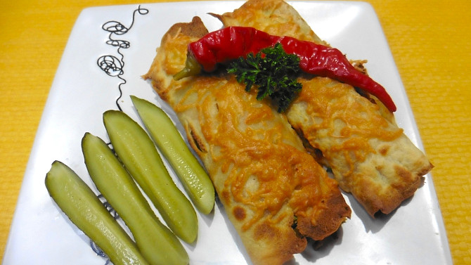 Zapečené palačinky plněné sýrem, bramborem a šunkou