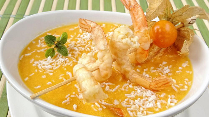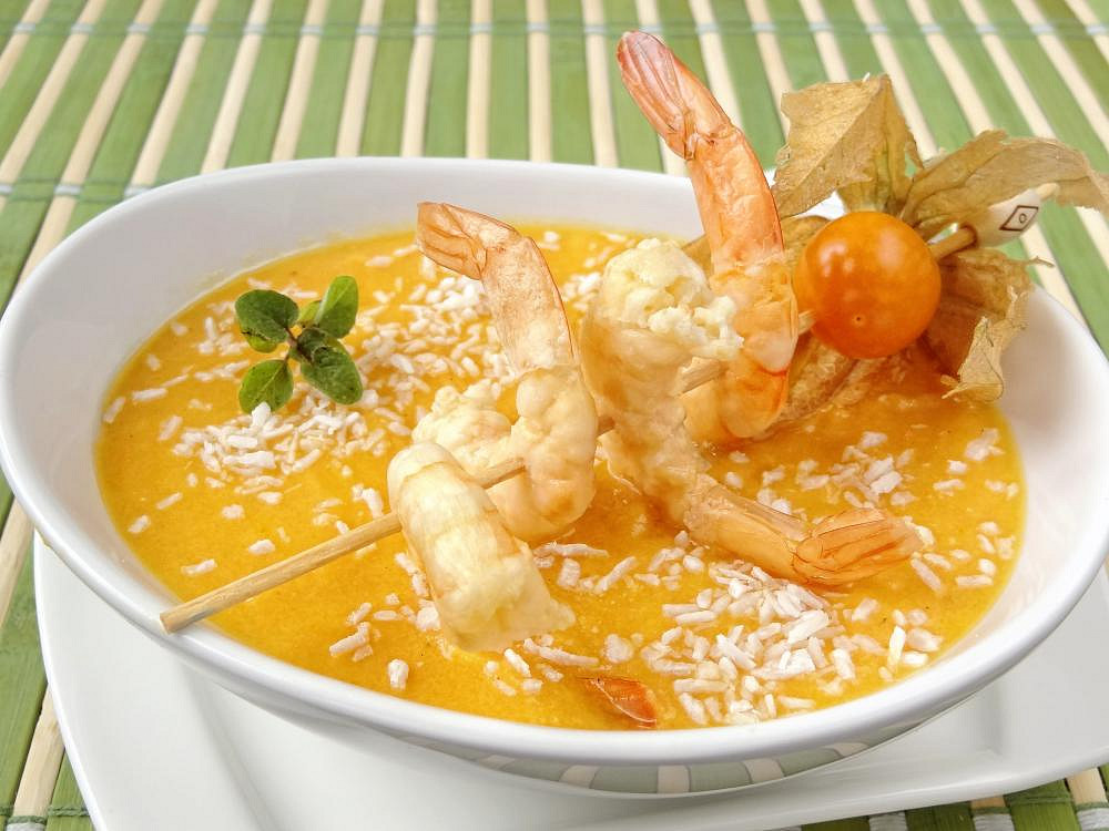 Mrkvová polévka s kokosovým mlékem a zázvorem voní exotikou. Jemný krém doplňují šťavnaté krevety na špízu a svěží citron, který zvýrazní jeho chuť. Spojení zeleniny, kokosu a zázvoru vytváří krémovou polévku s asijským nádechem.