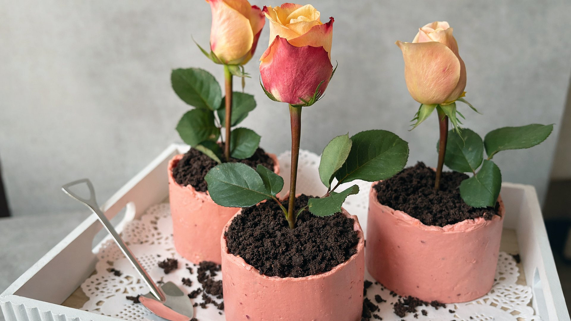 Jemné pistáciové dortíky promazané pistáciovým krémem a malinami připomínají malé květináčky ze zahrádky. Povrch zdobí Oreo drobenka, která vytváří efekt hlíny, a spolu s čerstvou květinou dodává hravý vzhled.