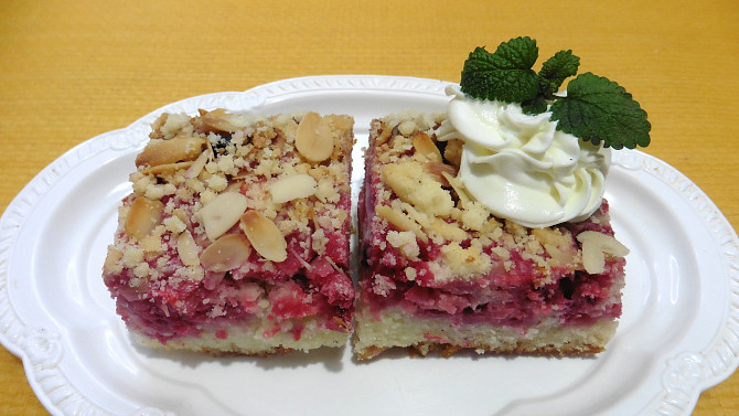 Krok 7: Povrch koláče posypeme rybízem. Na ovoce rovnoměrně rozdělíme drobenku a podle chuti přidáme mandlové lupínky.