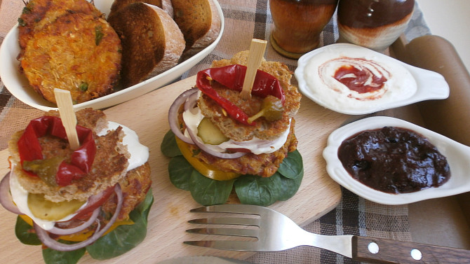 Krok 6: Burgery vkládáme mezi topinky, prokládáme nakrájenou zeleninou a přelijeme křenovým dipem nebo dipem dle své chuti.