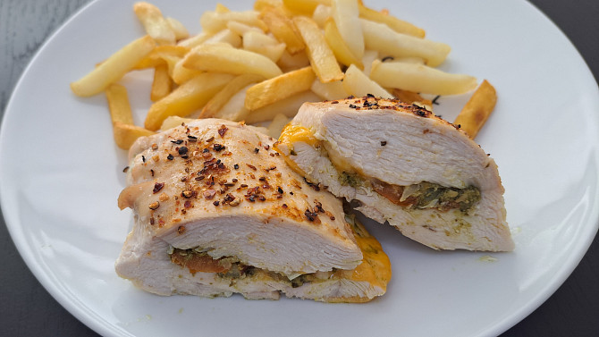 Pečená kuřecí kapsa plněná bylinkovým pestem, rajčetem, cibulí a sýrem je skvělým nápadem pro rychlý a nenáročný oběd. Příprava nezabere mnoho času a na výsledku si pochutná celá rodina.
