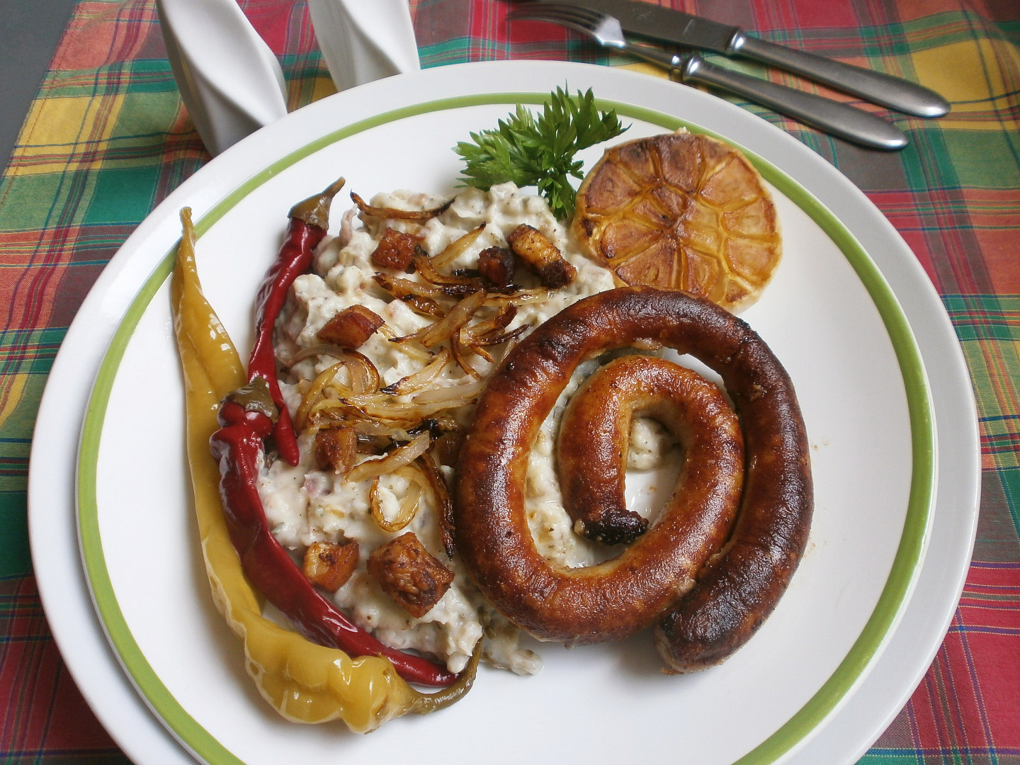 Nastavovaná květáková kaše s vinnou klobásou