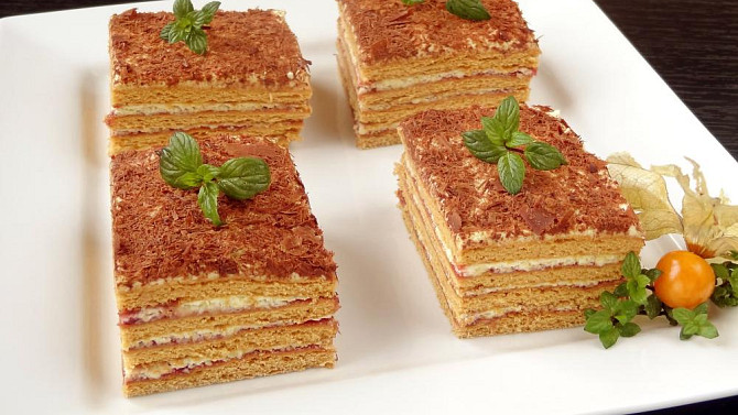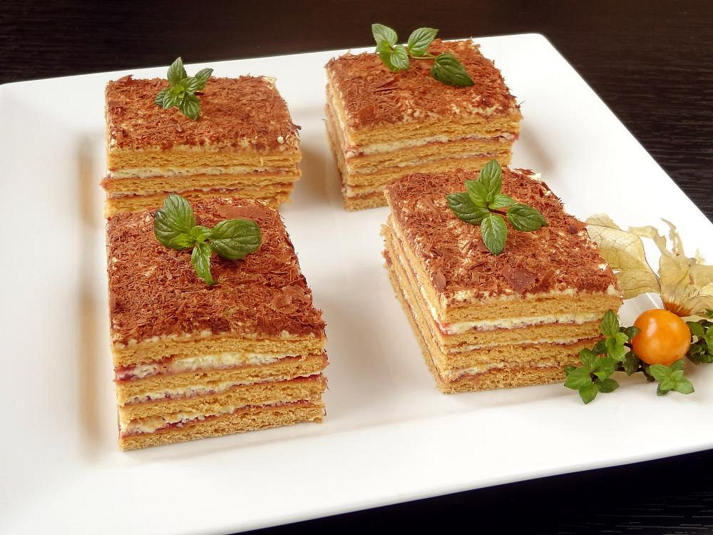Dopřejte si medové řezy s karamelovým krémem a rybízovou zavařeninou. Jemné pláty těsta provoněné citronem se po naplnění krásně rozleží a vytvoří vláčný moučník, který se skvěle hodí na oslavy i sváteční chvíle.
