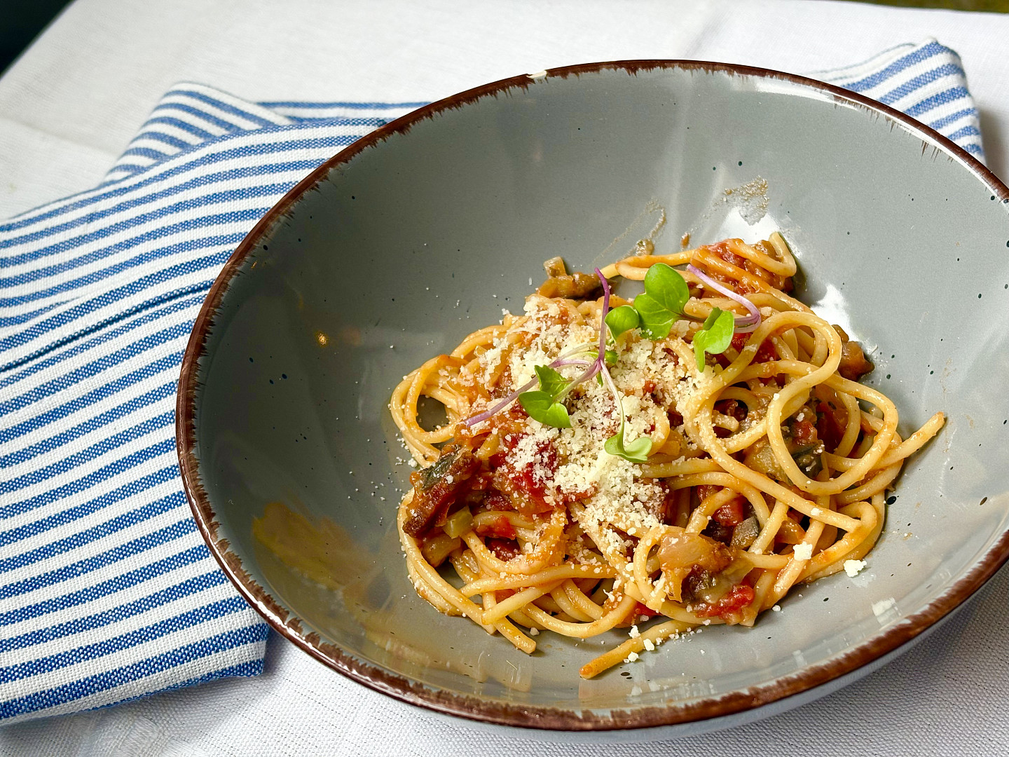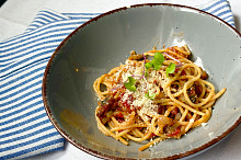 Špagety s lilkem, slaninou a rajčaty