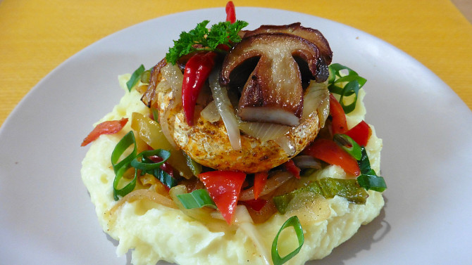 Krok 7: Na talíř dáme porci bramborové kaše, na ni položíme pečený sýr, navrstvíme pečené papriky s cibulí a hříbky, posypeme jarní cibulkou a podáváme.