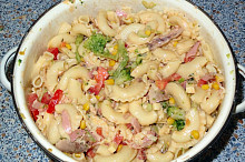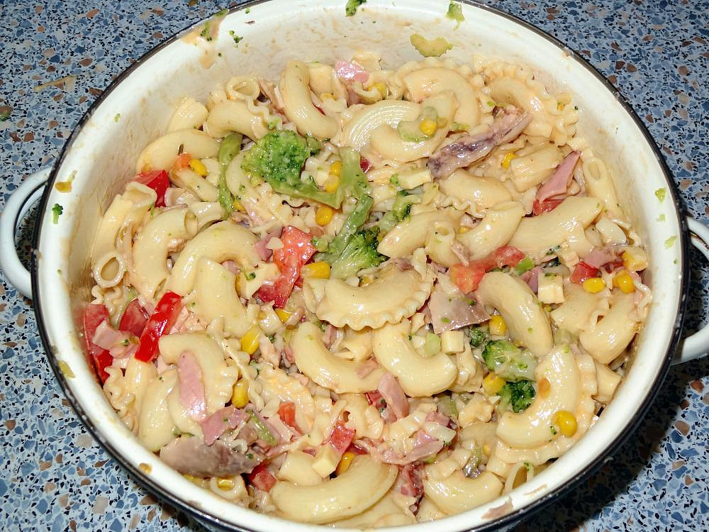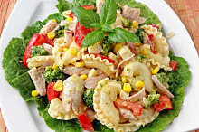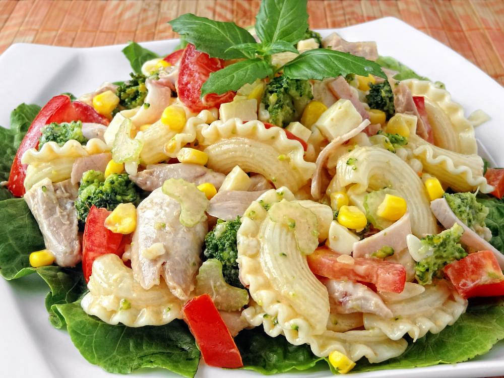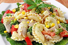 Těstovinový salát s pečeným kuřecím masem a zeleninou