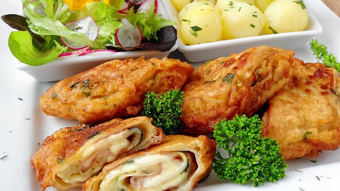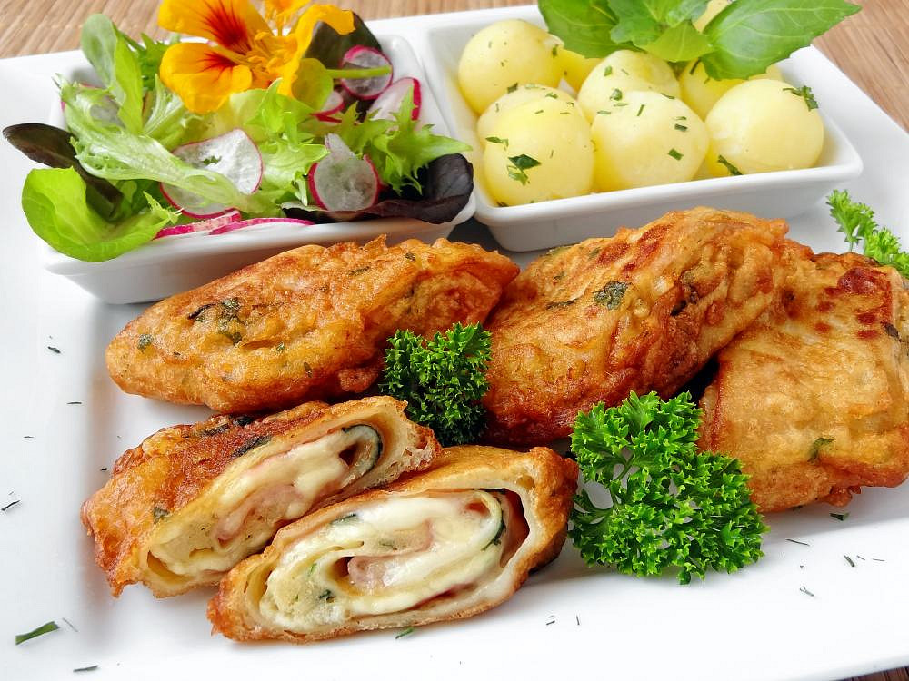 Máte chuť na originální slaný oběd? Vyzkoušejte smažené palačinky plněné šunkou, sýrem a sekaným listovým špenátem. Jsou obalené v nadýchaném těstíčku s petrželkou a po usmažení získají neodolatelně křupavou kůrku.