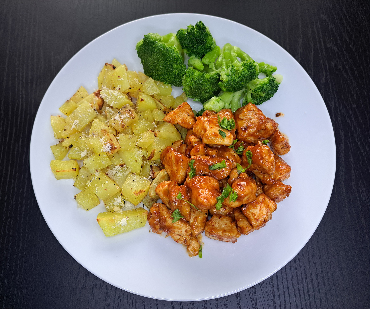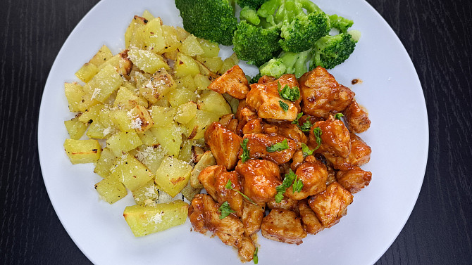 Připravte si skvělý oběd během chvilky. Šťavnaté kousky kuřecího masa krátce orestujeme a zvýrazníme směsí koření, medem a BBQ omáčkou. Doplní je brambory ochucené česnekem a zapečené s parmazánem spolu s vařenou zeleninou podle vaší chuti.