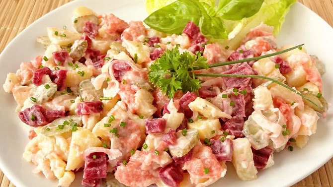 Krok 4: Do majonézového základu zlehka vmícháme připravené suroviny. Salát necháme odležet v lednici.