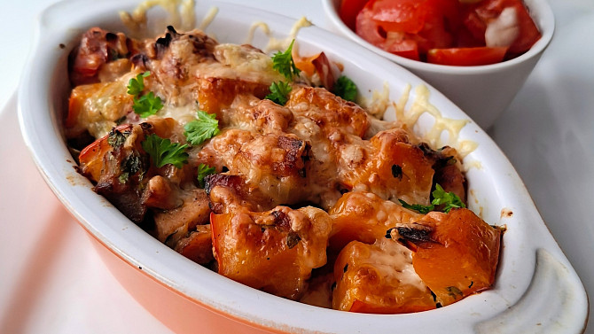 Dýně je v kuchyni právem považována za královnu zdraví – je plná antioxidantů, vitamínů a cenné vlákniny, která prospívá našemu zažívání. V tomto receptu ji využijete v kombinaci s česnekem, kapií, kvalitní šunkou a sýrem, dozlatova zapečenou v troubě.