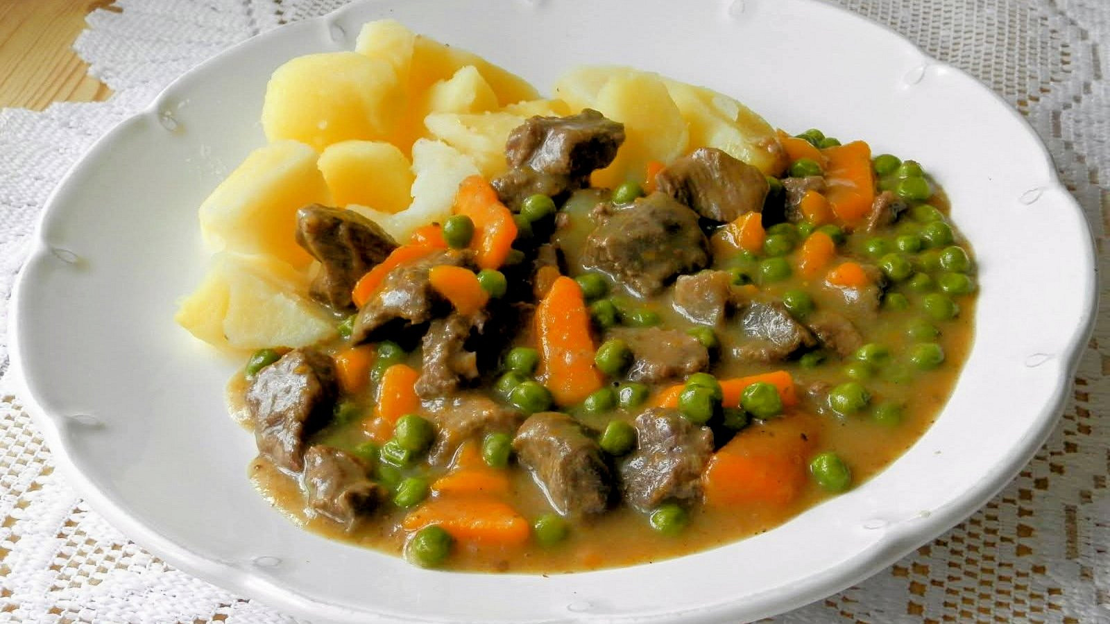 Máte chuť na klasické dušené hovězí? Kližku nejprve opečeme na cibuli se slaninou, poté ji pomalu dusíme doměkka a na závěr doplníme mrkví a hráškem. Jednoduchý a poctivý pokrm, který se skvěle hodí k bramborám.