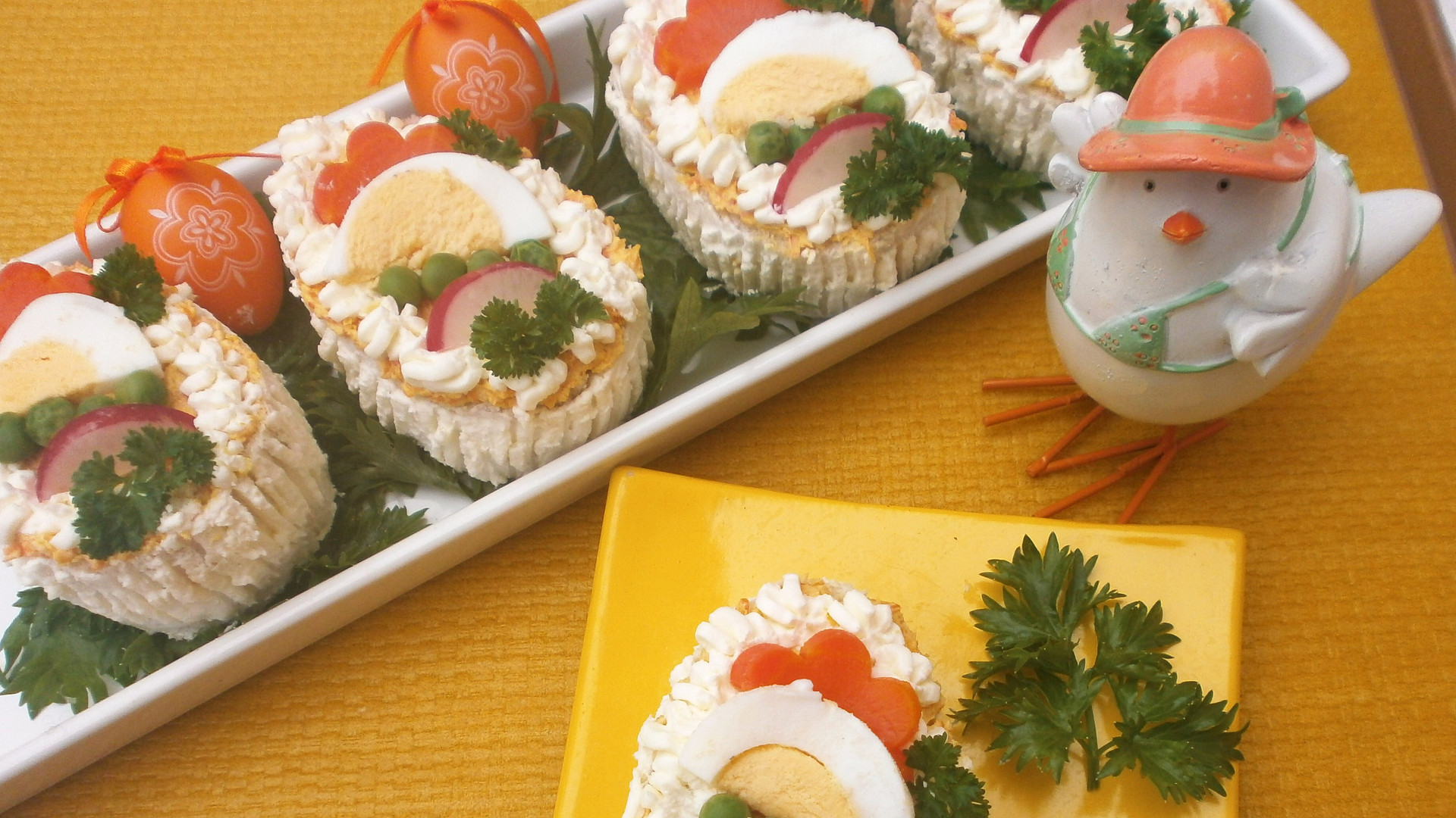 Jednoduché sváteční občerstvení pro návštěvu vytvoříte snadno z toustového chleba, mrkvové pomazánky, vajec a zeleniny. Tvar vejce jednoduše vykrojíte z chleba pomocí vykrajovátka na cukroví a pak už jen stačí jednotlivé kousky spojit pomazánkou, obmazat a ozdobit.