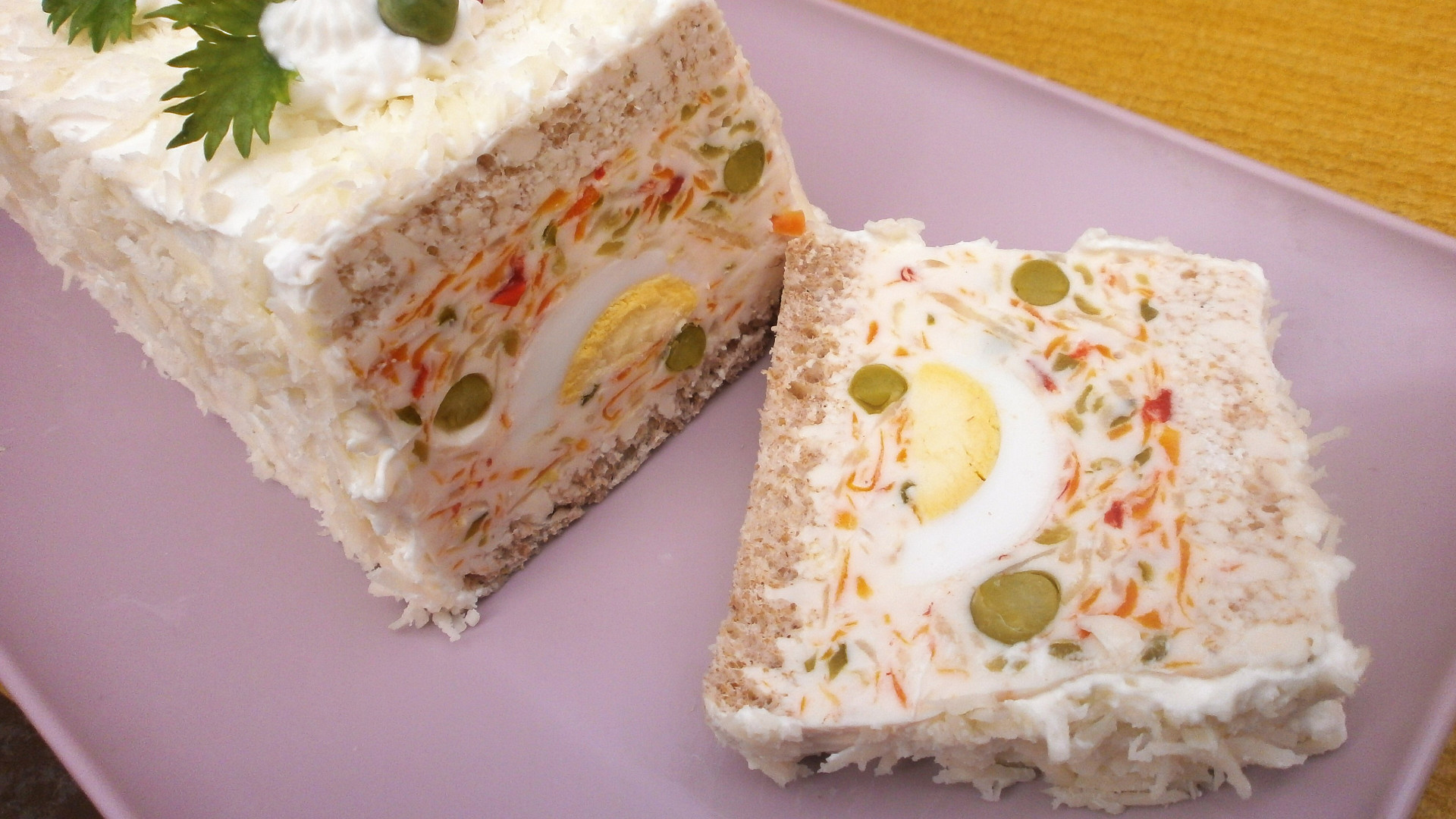 Svěží slaný předkrm, ve kterém se uvařená zelenina smíchá s jogurtem, majonézou a želatinou, doplní půlkami vajec a nechá ztuhnout ve formě vyložené toastem. Po vychlazení se řezy potřou tvarohovým krémem, posypou sýrem a ozdobí zeleninou.