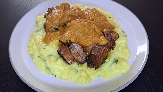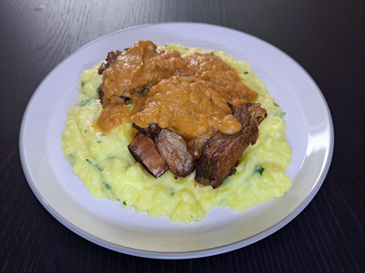 Šťavnatá hovězí žebra se nejprve restují dozlatova a poté pomalu dusí ve voňavé omáčce z restované kořenové zeleniny, červeného vína, česneku a bylinek. Jemnou chuť doplní rajčatový protlak a nádech pomeranče. Podávaná žebra s bramborovou kaší tvoří syté a lahodné jídlo.