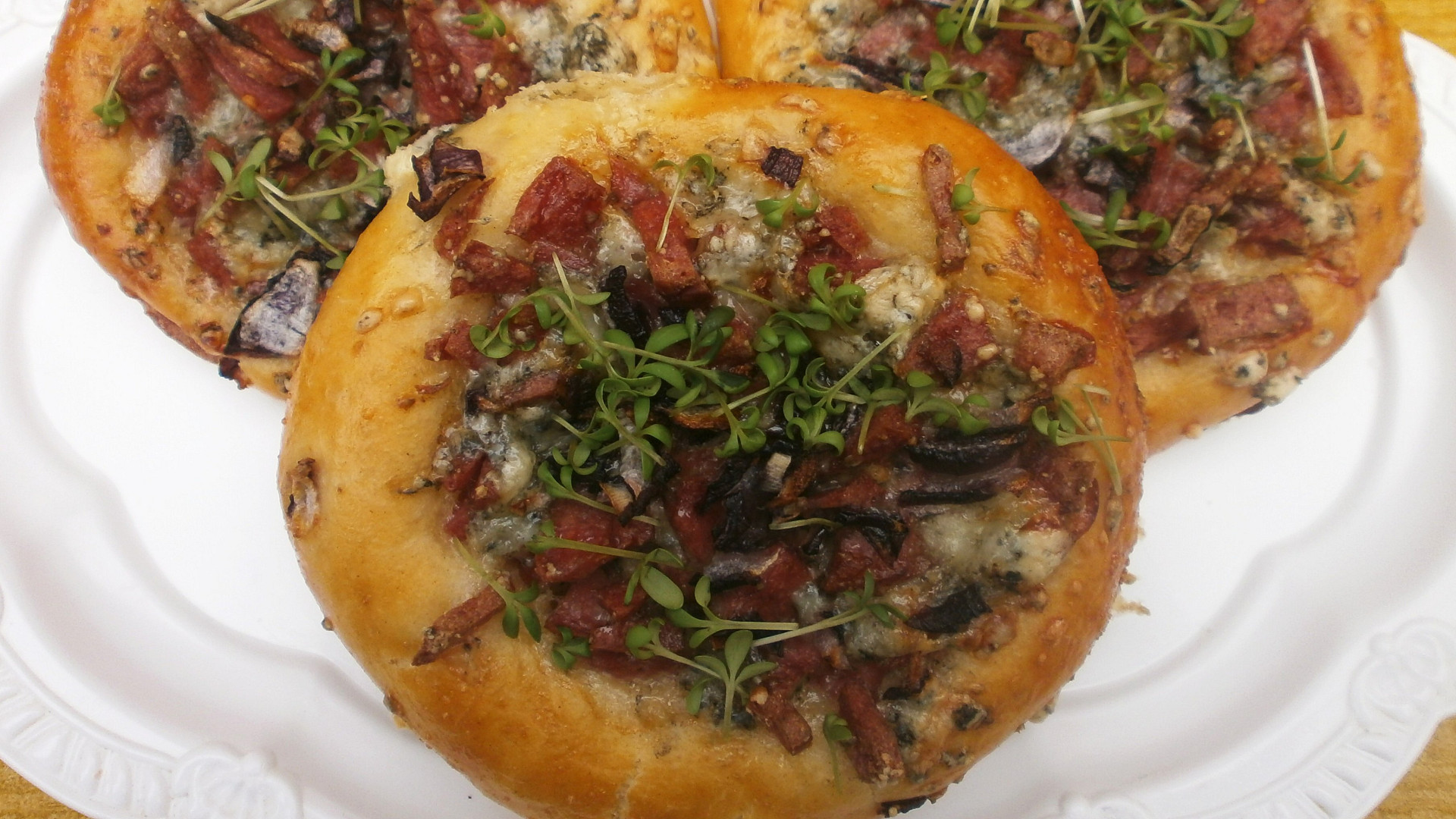 Krok 6: Koláče naplníme salámem, nivou a posypeme je nakrájenou cibulí. Ještě necháme