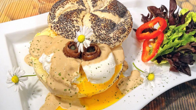 Krok 6: Na spodní část opečené žemle položíme ztracené vejce. Přelijeme majonézou, ozdobíme zbylými sardelkami a přiklopíme vrchním dílem žemle.