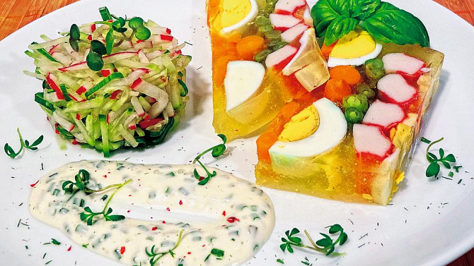 Přemýšlíte, jak využít vykoledovaná vejce? Připravte z nich lahodný aspik z hovězího vývaru a krabích tyčinek. Aspik je doplněný svěžím a křupavým salátem a jemnou pažitkovou omáčkou. Podávat jej můžete jako večeři i studený předkrm.
