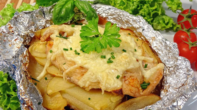 Šťavnaté vepřové kotlety pečené v alobalu se šunkou, eidamem a voňavou slaninou. Společně s bramborami, cibulí a mletou paprikou tvoří syté jídlo z jednoho balíčku, ve kterém se během pečení všechny chutě masa a přílohy dokonale propojí.