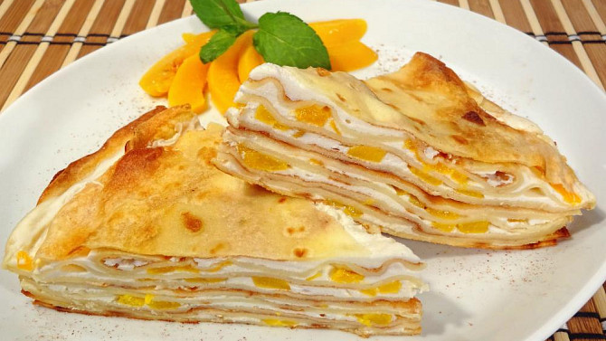 Milujete palačinky a sladké nákypy? Tento recept spojuje obojí v jeden dokonalý pokrm. Tence usmažené palačinky plněné jemným tvarohem, promazané rybízovou marmeládou a proložené broskvemi stačí zapéct dozlatova a podávat.