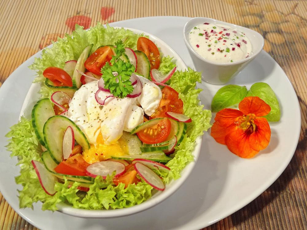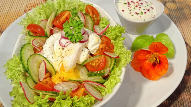 Svěží jarní salát z křupavých ředkviček, okurky a cherry rajčat doplněný o krémovou zálivku se zakysanou smetanou a kapkou sherry. Dominantou salátu je zastřené vejce, které po rozkrojení krásně doplní chuť hořčice a listového salátu.