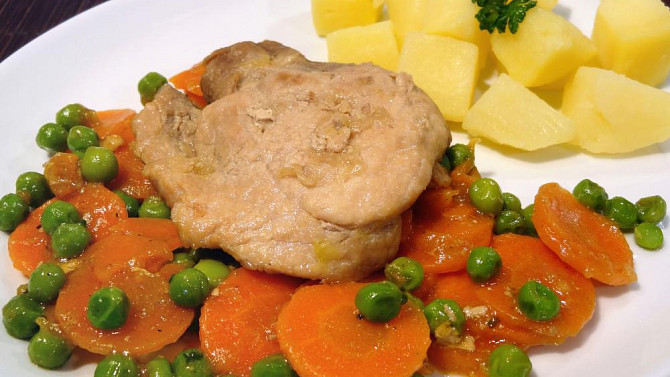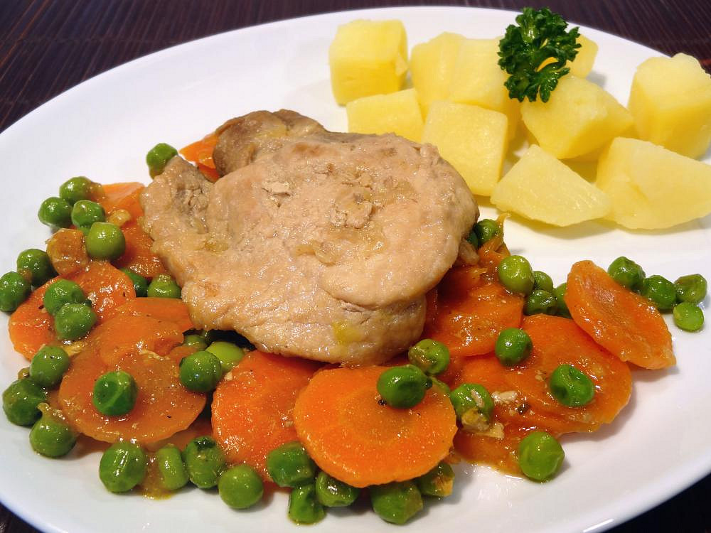 Kotlety na víně s hráškem a mrkví