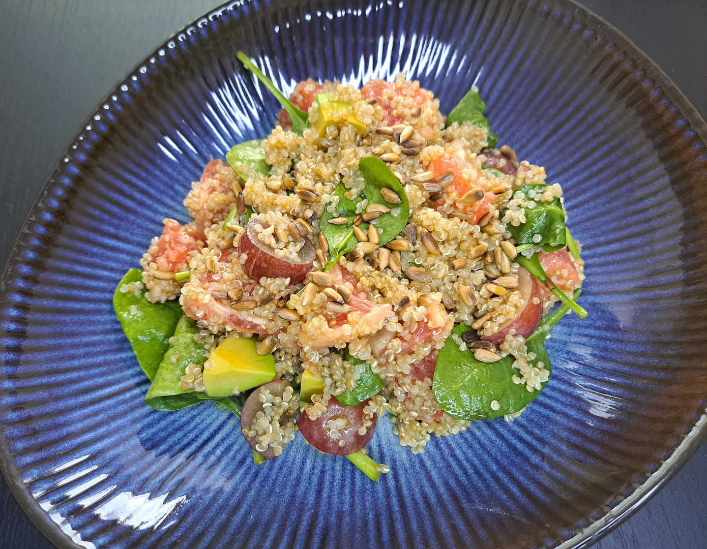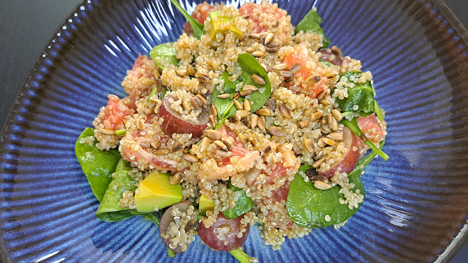 Tento svěží jarní salát je postaven na kombinaci quinoy, grepu a avokáda. Sladké hrozny vyrovnávají hořkost grepové šťávy v zálivce a baby špenát dodává pokrmu lehkost a čerstvost. Před podáváním salát posypte opraženými slunečnicovými semínky.