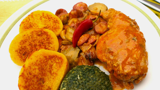 Uherská králičí stehna s pikantní klobásou a cibulí nabízejí výraznou a plnou chuť. Maso se pomalu dusí, díky čemuž zůstává šťavnaté a krásně se rozpadá. Kořeněná omáčka skvěle doplní přílohy jako knedlík či chléb a potěší milovníky vydatných jídel.