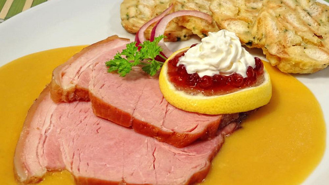 Krok 9: Uzenou kýtu nakrájíme na plátky, rozdělíme na talíře a přelijeme omáčkou. Doplníme plátkem citronu, lžičkou brusinkového kompotu, šlehačkou a ozdobíme snítkou petrželky.