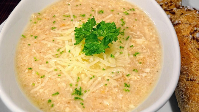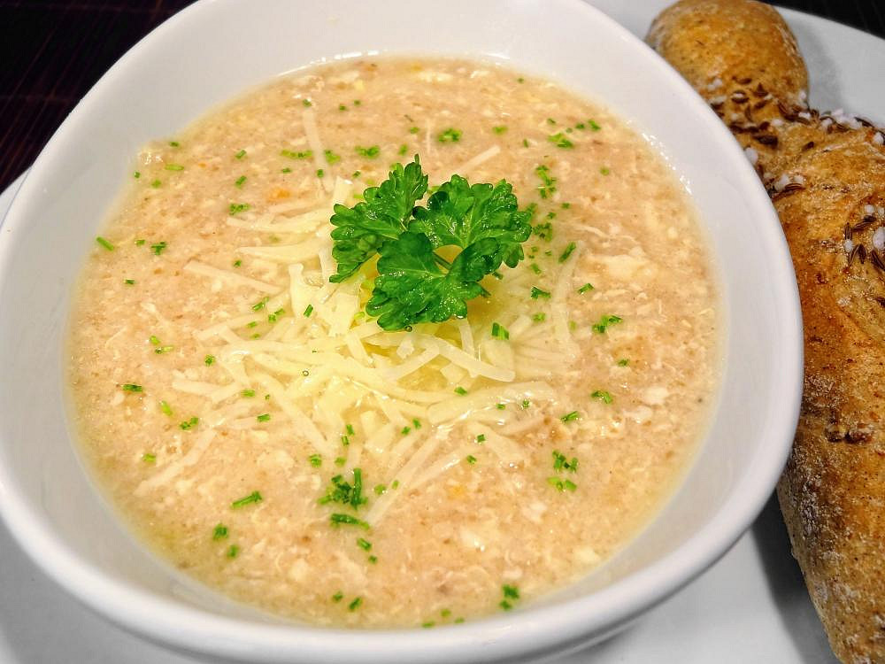 Připravte sytou sýrovou polévku s vůní muškátového květu. Základem je poctivý hovězí vývar, který ve spojení s rozpuštěným eidamem vytvoří jemný a lahodný krém. Polévku na talíři doplňte nudličkami výrazného ementálu a posypte bylinkami.