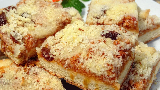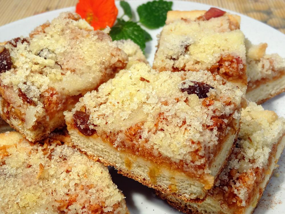 Vychutnejte si nadýchaný kynutý koláč s bohatou vrstvou šťavnatých jablek, rozinkami a hřejivou skořicí. Lahodný moučník s poctivou porcí sladké drobenky provoní celou kuchyni a rázem vykouzlí útulnou atmosféru domova.