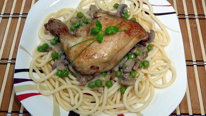 Kuřecí stehna na žampionech s hráškem