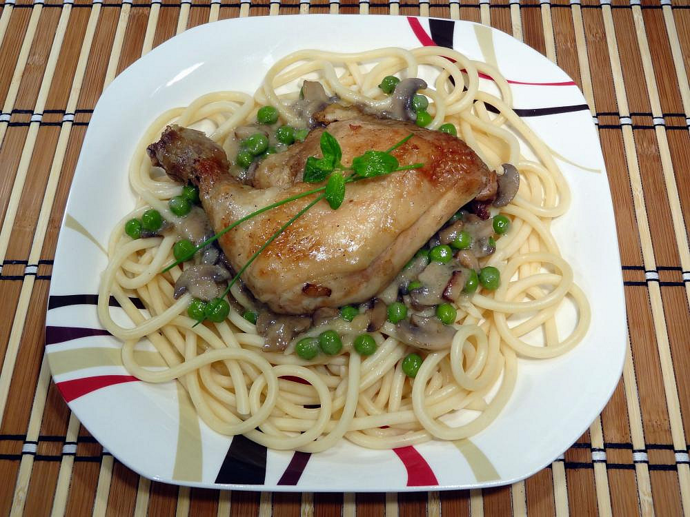 Vyzkoušejte upéct kuřecí stehna na slanině a žampionech s jemnou smetanovou omáčkou a hráškem. V kombinaci s těstovinami bucatini, které skvěle drží omáčku, tvoří toto jídlo dokonalý celek. Skvěle se hodí i pro sváteční rodinný oběd.