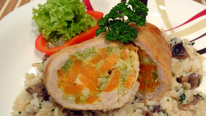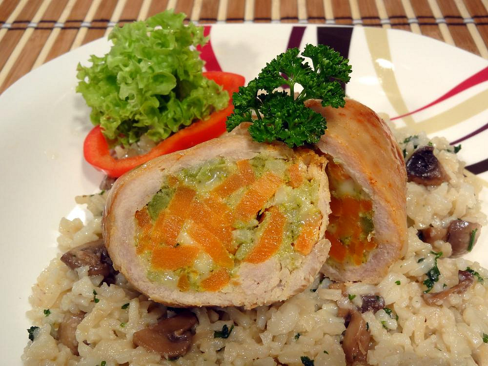 Luxusní vepřové závitky plněné mrkví a brokolicí jsou dochucené parmezánem a pikantní kremžskou hořčicí. V kombinaci s vínovou redukcí, restovanými žampiony a nadýchanou rýží tvoří toto jídlo elegantní a barvami zářící sváteční oběd.