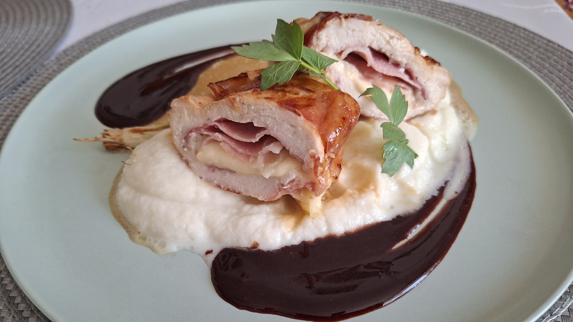 Plněné kuřecí prso s květákovým pyré a balsamikovou omáčkou
