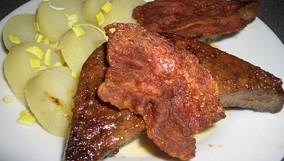 Krok 4: Játra vyndáme, pokapeme tabascem a podáváme ozdobené plátky slaniny. Podáváme s brambory.