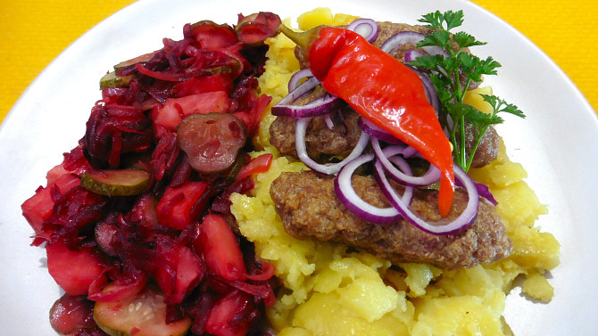 Maso a zelenina, dvojice, která pravidelně patří do našeho jídelníčku. Připravte si šťavnaté smažené masové válečky se zeleninovou oblohou. Na tu podusíme směs z červené řepy, celeru, okurek a cibule.