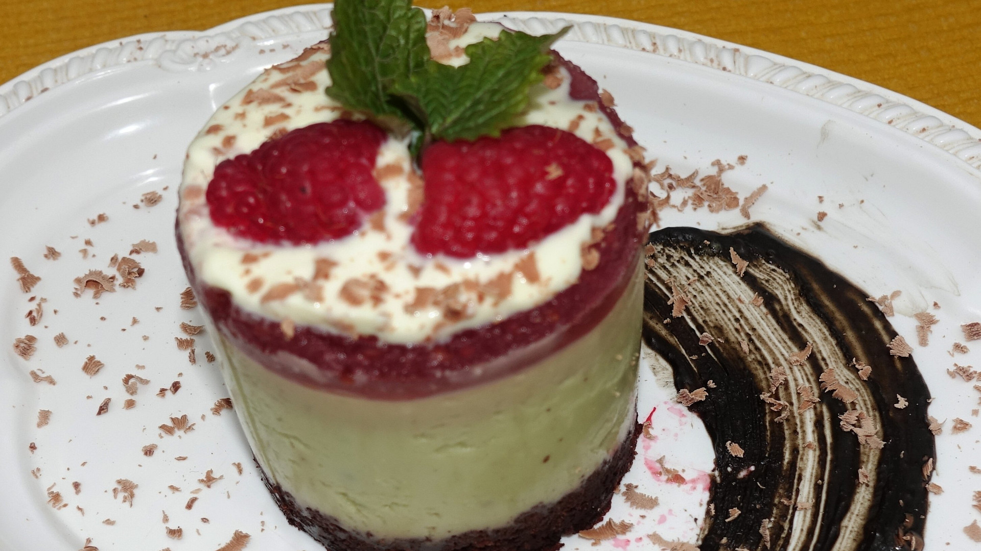 Krok 4: Vršek dezertu dozdobíme lžičkou oslazeného jogurtu, nastrouhanou čokoládou, malinami a meduňkou. Před podáváním odstraníme formičky.