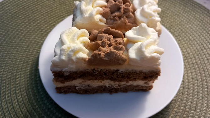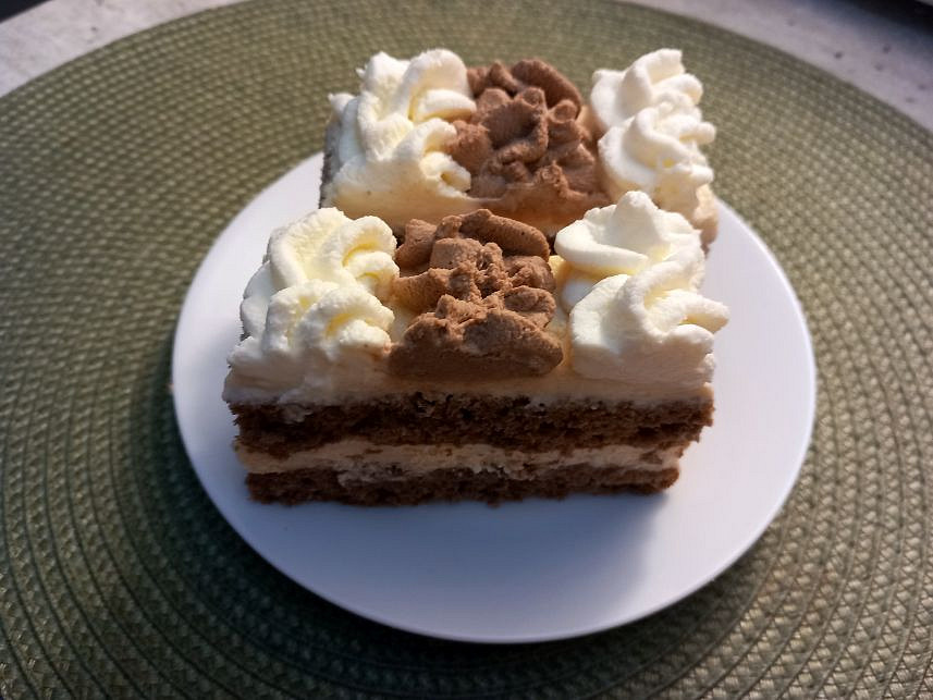 Nadýchaný kakaový korpus upečeme, necháme vychladnout a naplníme jemným meruňkovým krémem z tvarohu a másla. Povrch ozdobíme šlehačkou ve dvou variantách a necháme ztuhnout. Vzniknou efektní řezy vhodné ke kávě i pro slavnostní příležitosti.